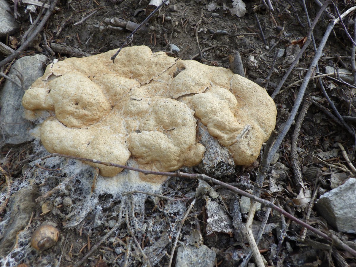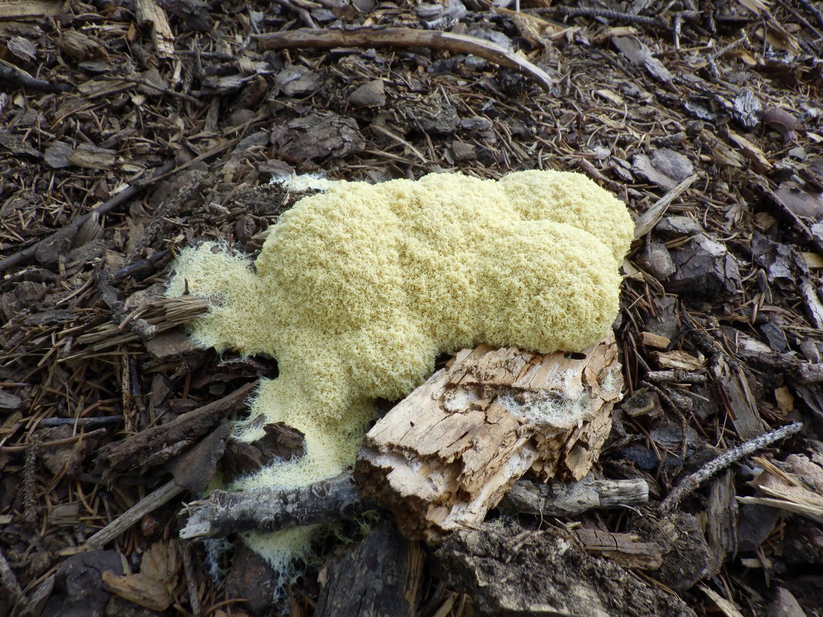 Googeln bringt dann als Ergebnis verschiedenen Schleimpilzarten hervor, die sich bei feuchter Witterung auf Holz beginnen auszubreiten und auch noch zu wandern.
