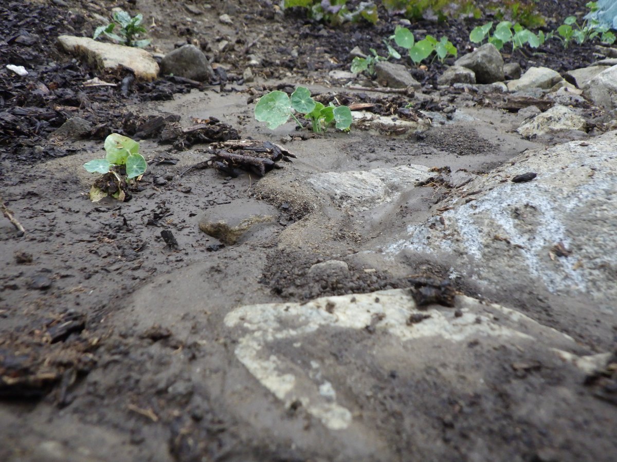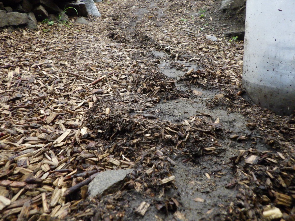 Neben Erosion, wie sie funktioniert gut zu beobachten in gemulchtem Material, tauchen plötzlich seltsame Flecken auf, als hätte jemand Bauschaum verloren...